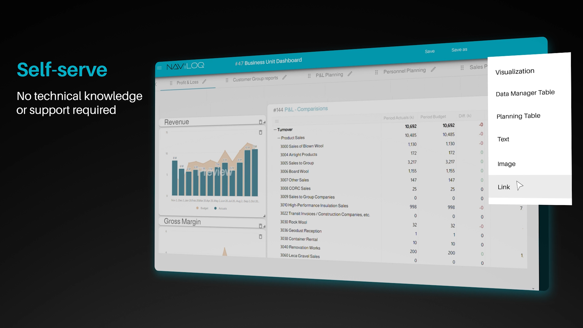 Naviloq is built to provide critical insights, with finance at its core, while being driven by a whole business perspective. As a business intelligence tool, Naviloq offers visual insights through flexible dashboards tailored to your needs.
